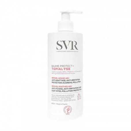 Topialyse baume protect + SVR est un soin relipidant pour le visage et le corps qui peut s'utiliser dès la naissance. Cette crème riche répare et soulage immédiatement et durablement les sensations de démangeaisons et les irritations grâce notamment à sa richesse en céramides AD. Elle contient aussi des omégas 6 et 9 et un fructane issu de muguet du Japon qui apaise, restaure la barrière cutanée, maintient le microbiote cutané, hydrate la peau et a une action anti-démangeaison.